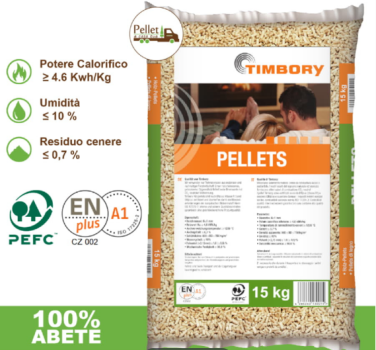 TIMBORY: pellet di legno di 100% abete classe A1, di alta qualità, potere calorifero maggiore di 4,6 kWh/Kg, tasso di umidità inferiore a 10% e residuo di cenere minore dell 0,7%.